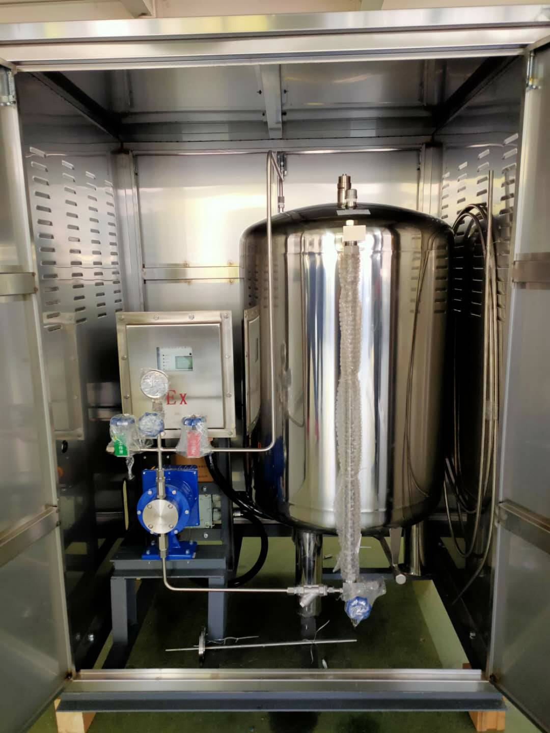 主要配置:1台防爆单片机控制器/1台防爆电磁泵/1台60L不锈钢储罐/1台设备箱